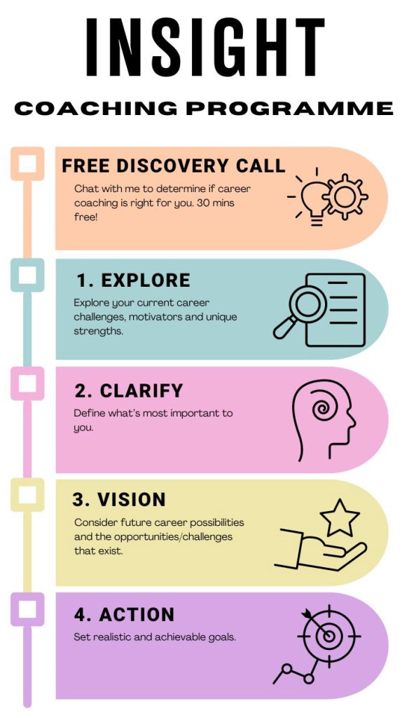 My career coaching sessions are approx. 60 minutes long and we’ll usually work together on a fortnightly or weekly basis for x4 sessions. You’ll receive some home exercises after each session containing thought provoking questions, so you will need to set aside some time between sessions to complete these.